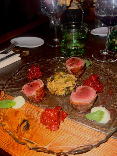 La cena è stata un vero trionfo di sapori. Abbiamo iniziato con un delizioso tortino alla zucca, perfettamente bilanciato nel gusto e presentato con maestria. Seguendo, la carne di cervo era squisita: tenera, cucinata alla perfezione e accompagnata da un insieme di contorni che ne esaltavano il sapore ricco e profondo, il tutto accompagnato da un ottimo calice di vino rosso.
