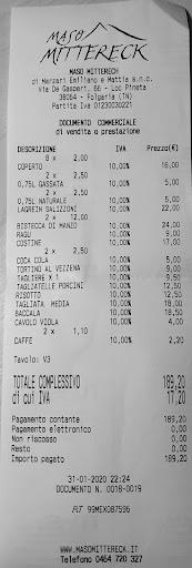 Read moreAl maso mitterck, è stata una scenta casuale dopo un giro in moto. Abbiamo trovato un ambiente tranquillo pulito con personale molto gentile e servizio anche veloce. Abbiamo ordinato, per me un piatto formaggio di lavarone in tre consistenze e ho chiesto il tortino di patate in sostituzione dei funghi; e per mio marito formaggio tipico con polenta e funghi. Nel complesso entrambi i piatti si sono rilevati un ottima scelta, il tortino di patate, sapore buono ma troppo pieno di olio, "la frittura" perdonatemi era errata, mentre il piatto ordinato da mio marito saporita la polenta e il formaggio impanato, sui funghi purtroppo nutro un dubbio(mi davano l impressione di funghi surgelati provenienti dalla grande fistribuzione). Do 4 stelle perché anche perché ritengo, conoscendolo il mondo della ristorazione che non è facile, e poi perché entrambi i piatti sono stati piacevolmente...