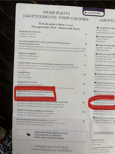 Our antipasti were enjoyable, but our entrees were completely disappointing. The buttered trout seemed to be neither trout nor buttered, and had no flavor at all. The bigolo alle sarde was so salty that it was inedible. When I discretely mentioned this to our waitress, she only argued with us, trying to explain to me what a salted sardine is, and that everyone always complains that this dish is too salty. (Shouldn’t that tell you something about your cooking?) No apology or any offer to improve our experience. After all of this, she laughed at my dad while he was putting on his reading glasses to see the check. Seriously?