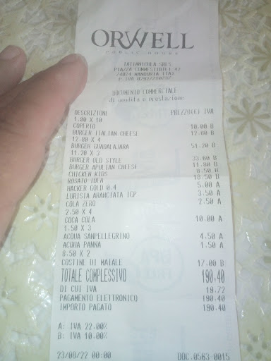 Orwell Public House volevo dire qualcosa sulla risposta data al commento del Sign. Schiattarella Credo di non essere stato in nessun caso maleducato. Perché Sui panini neri che non abbiamo richiesto e dopo 54 minuti che aspettiamo arrivano e ci viene detto che il panino bianco è finito, le cotture prefissata in un tempo record di 20 minuti arrivate tutte sbagliate, le patatine li poteva contare anche uno che non sa cos'è la matematica, la cotoletta della bambina che a quando era dura saltava dal piatto (poi da voi rifatta) dimenticavo le costolette di maiale trasparenti e riscaldate con una spennellata di non so cosa e alla mia osservazione mi ha risposto che erano fatte fresche poi messe nell'abbattitore e poi riscaldate (in modo pietoso e superficiale) andrebbe scritto o per lo meno detto, servizio pressoché inesistente e se non e stato da parte vostra maleducato dire ad un tavolo di 11 persone che avete altri tavoli da servire e non solo noi non saprei chi è maleducato. Vorrei sapere anche con chi dovrei essere stato maleducato visto che sono venuti tutti i vostri collaboratori e per finire 10 minuti dopo aver ricevuto i nostri panini al tavolo accanto arrivano i panini Bianchi. Se questa e maleducazione penso che già all'arrivo dei panini dovevo farmi vedere maleducato invece. Io credo di aver aver avuto ricevuto un buon grado di educazione dai miei e quindi non solo avete insultato me ma anche chi mi ha educato. Consiglio per voi cercate di essere umili e accettare le critiche finché sono costruttive perché con l'arrampicarsi sui vetri si rischia di cadere e farsi male. P.s. sono stato il primo a dire che la qualità della carne era ottima e solo questo è un punto a vostro favore per il resto credo di essere stato maleducato in queste 2 righe e pensare che non volevo scriverla neanche la recensione...... Cordiali saluti Lupo Paolo Antonio