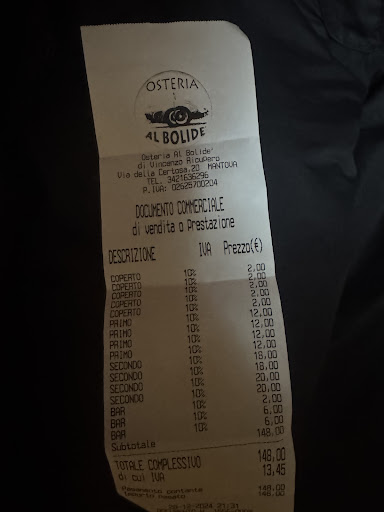 Read moreQuesta sera ho avuto il piacere di cenare all'osteria del Bolidè, un piccolo angolo di tranquillità dall'atmosfera familiare e piacevole, reso indimenticabile dalla gentilezza e professionalità del Sig. Vincenzo, della Sig.ra Giorgia e della loro figlia Aurora. Sono stato calorosamente accolto e servito da Federico, un vero professionista che ha reso la mia serata ancora più piacevole. Le conversazioni con il Sig. Vincenzo e il resto della sua famiglia hanno reso il mio soggiorno come a casa, e facendomi sentire sempre a mio agio. L'osteria è gestita con passione dalla famiglia, e si nota il loro gusto raffinato nel creare un'atmosfera semplice ma accogliente. La cucina mi ha sorpreso con sapori genuini e porzioni abbondanti. Su consiglio del Sig. Vincenzo, ho assaggiato l'antipasto di polenta e salame mantovano, seguito dai maccheroncini con zucca e salsiccia, un'autentica esplorazione dei sapori della cucina mantovana che mi ha lasciato veramente soddisfatto. Non vedo l'ora di tornare all'osteria, soprattutto perché mi hanno detto che nel weekend offrono anche musica dal vivo, dimostrando un impegno straordinario nel dare vita a un'esperienza culinaria completa e coinvolgente....