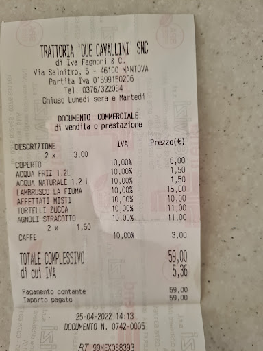 Read morefamoso per i bolliti misti (manzo, lingua, gallina, cotechino, con mostarda + salsa verde) e lo stracotto d'asino (che abbiamo preso come condimento dei maccheroni), ma anche i primi sono buoni (abbiamo provato oltre ai maccheroni anche tortelli di zucca e agnoli al burro, fatti in casa). con acqua, quartino di rosso, dolci (prugne col gelato ed elvezia) e due caffè, si spende 37€ a testa. ambiente casalingo, quello delle vecchie trattorie, servizio puntuale. // ritornati a gennaio 2018: consiglio caldamente di non perdere il tris di primi fatti in casa (maccheroncini allo stracotto + tortelli di zucca + agnoli burro parmigiano): è una porzione abbondante che costa 13€ a testa, obbligatorio per 2 persone, ma io direi obbligatorio per chi viene a mangiare qua. poi per i secondi, sempre a 12€ consiglio di sicuro il misto di bolliti (cotechino + manzo + gallina + lingua) da abbinare a salsa e mostrada per 4€. oppure buono anche lo stinco. fra i dolci, consiglio la tipica torta elvezia e uno dei tanti semifreddi. buono il caffè. gentile il servizio, accogliente l'ambiente, in una zona di mantova al riparo dalle resse del centro. due coperti, 33cl di lambrusco, 1 acqua, 2 tris di primi, 1 bollito misto con salsa e mostarda, 1 stinco al forno con verdure (pure spinaci peperonata), 2 dolci 2 caffe, spenderete 42€ a testa ed è tutto buono e non vi alzerete certo con la fame. se si vuol spendere meno in due, consiglio comunque di non rinunciare al tris di primi e ai dolci, ma al limite per secondo spartirvi il bollito misto che è abbondante e prendere solo salsa e mostarda senza le verdure miste. in quel caso spendereste circa 35€ a testa, e sarebbe...