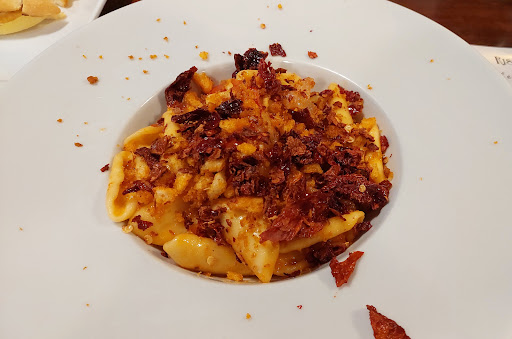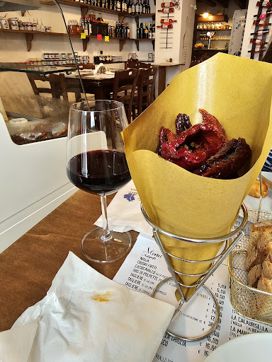 Read moreSiamo arrivati in un momento in cui il locale, non particolarmente grande, era abbastanza pieno all'interno, dovendo attendere qualche minuto prima di essere accolti da qualcuno. Una volta accomodati abbiamo notato che c'era un'unica persona che doveva gestire tutta la sala, quindi ci siamo un po' preoccupati sul tempi di attesa; alla fine il servizio si è velocizzato, forse perché si è aggiunto un aiuto. Passando al cibo, abbiamo potuto gustare un ottimo primo piatto (rascatelli pancetta, crusco e mollica) ed una simpatica focaccia (la calabrisella) che abbiamo diviso. Molto carina l'idea di unire ristorazione e commercio dei prodotti locali, anche se una sala era ricca di prodotti, l'altra più "anonima". Rapporto qualità/prezzo interessante. La location è situata in centro cittadino, quindi in ZTL (a seconda degli orari), e bisogna posteggiare a pochi minuti a piedi. Ci...