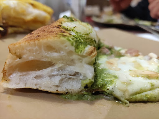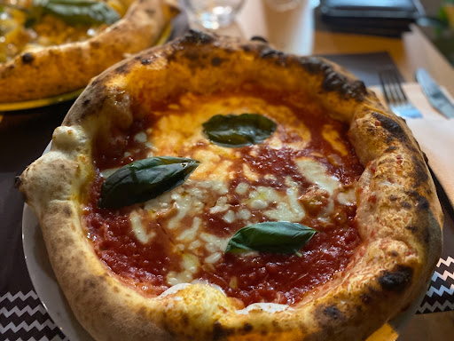 Abbiamo scelto le nostre tre pizze chiedendo la cortesia che ci venissero servite una alla volta. La scelta del pizzaiolo come prima pizza è stata la"Nonna Maria" fritta e asciugata al forno con sugo alla genovese. Ero titubante perchè tra frittura e genovese temevo risultasse eccessivamente… eccessiva. Mi si è invece aperto un mondo di sapori, equilibri, cotture maestrali. È la pizza fritta più buona mangiata fin ora in vita mia, morbida e soffice dentro quasi si scioglieva e crunchyante fuori grazie ad una frittura perfetta. La genovese era gustosissima e davvero ben fatta. Unica pecca come già ho avuto modo di riferire era la temperatura del sugo un po' freddino rispetto alla base. Peccato perché merita davvero. La seconda pizza è stata la "Sapori d' Autunno" :vellutata di zucca, porcini, salsiccia, provola e scaglie di caciocavallo. Ottima anche questa grazie alla ottima qualità degli ingredienti. Infine la "Paesana" con vellutata di friarielli, salsiccia, mozzarella e petali di mandorle. Molto buona anche questa nonostante la vellutata tenda a smorzare troppo quel tocco aggressive che ci si aspetta dai friarielli. Abbiamo bevuto un ottimo "Maremma Toscana doc, Ciliegiolo Morellino di Scansano". Ho trovato un impasto di base spettacolare, che il giorno dopo è buono allo stesso modo, come fosse appena stato fatto, un'ottima shelf life sia per consistenza, che profumi che...