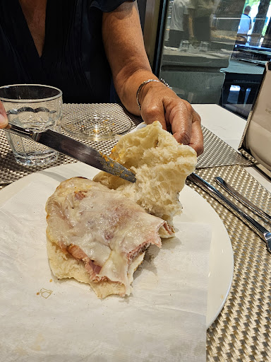 First things first, you see the menu but it makes no sense. It's a wall full of text, listing the ingredients in Italian only. For a place with so much international traffic very unsuitable. The service is not helpful at all, no welcome, no explanation of the menu, nothing. They have 20+ staff members, yet none of them is motivated or nice. The food, although cheap, is fast food. The "kitchen" items are fast food as well, the Pizza arrived too fast. The dough was soft and moist, the toppings tossed on top with no care at all and falling off while eating. Additionally, they didn't cut the Pizza and the knife at the place was not sharp enough. After asking the staff to cut it, they asked us if it didn't work for us. After telling them 3 times they finally cut it. The sandwich: judge for yourself (Amalfi). We don't expect much from restaurants in an outlet. Still, some standard of service...