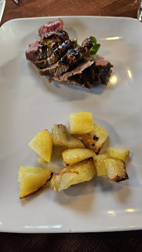 Capitiamo per caso in questo locale in una sera d'agosto. Il menù offre una buona scelta, ma optiamo (in due persone) nel "menu carne" che offre un percorso guidato dall'antipasto al caffè, mentre una terza sceglie due portate alla carta. Pensiamo che, visto il prezzo (buono) ed il numero di portate le porzioni siano ridotte ed invece la prima sorpresa la abbiamo agli antipasti: un ricco tagliere misto di salumi e formaggi (alcuni davvero ottimi) serviti con sottaceti e sottoli. Segue un bis di primi (giustamente porzioni ridotte di entrambi) ma ci viene offerto un ripasso (gradito) di risotto. La carne (tagliata con patate) viene servita in una porzione giustamente inferiore al normale, ma ci viene comunque chiesto se ne avessimo voluta ancora. Chiudiamo con sorbetto (la cheesecake della foto è della persona che non ha fatto menù di carne) e caffè il tutto consumato con una buona bottiglia di vino Valtellinese. Che dire....ci torneremo per provare, magari in altre stagioni, i piatti proposti. Mi permetto di fare una menzione particolare al giovane cameriere che ci ha seguito con attenzione, visto (e discrezione) per tutto il tempo: un vero professionista nonostante la...
