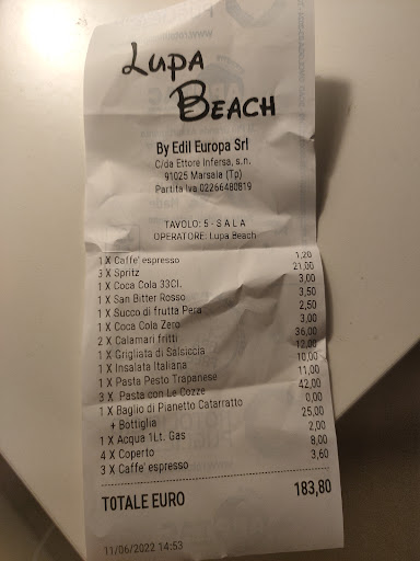 Negativo. La mia professione mi porta sempre a dover esaminare dove e cosa mangio e soprattutto come vengo servito e cerco sempre di motivare la mia recensione in proporzione al luogo. Spesso chi non dimostra la propria professionalità tende a non accettare il mio giudizio, che non è vincolante ma è pur sempre un giudizio obiettivo e professionale. Detto questo, del Lupa Beach posso dire che la location è suggestiva con l'aperitivo al tramonto in riva al mare. I titolari e il personale abbastanza cordiali e alla buona, non certo professionisti del settore. voto 7 Menù Aperitivo: Dei buon cocktails ma con prezzo superiore alla media per un locale in spiaggia, gli stuzzichini (pagati a parte) non rientrano nell'aperitivo e lasciano molto a desiderare nella quantità insufficiente in proporzione ai cocktails ordinati e certamente cari per il contenuto , a mia richiesta vengono però integrati con delle semplici arachidi. voto 5 La Cena. Antipasto: Zuppa di cozze al pomodoro. Non esattamente ciò che mi aspettavo da un localino sulla spiaggia e con cucina casereccia , saltate nel sugo hanno rilasciato tutta la loro acqua andando così a danneggiare il sugo stesso risultato annacquato e poco invitante voto 6 Primo piatto Saghetti al pesto trapanese Buono il sapore del sugo, peccato che anche questo è risultato annacquato voto 6 Secondo Spada grigliato Nulla di eccezionale, e in base al prezzo avrei sperato in qualcosa di diverso. voto 5 Insalatona all'Ortolana, troppo cara per ciò che offriva Voto 5 Complessivamente menù voto 5,4 Il conto risulta caro per ciò che si è consumato e non proporzionale alla tipologia del locale voto 5 Servizio adeguato al posto, quindi molto spartano voto 6 Servizio spiaggia, più o meno adeguato al prezzo. Ricapitolando Location 7 Menù 5,4 Servizio 6 Conto 5 Complessivamente 5,85 che porto a 6 per la disponibilità del titolare che comunque saluto e ringrazio per l'impegno. Mi dispiace ma valuto 2 stelle non all'altezza dei prezzi indicati. Non mi sento di sconsigliare questo locale che al tramonto offre uno spettacolo da non perdere, per il resto ognuno scelga come crede, io ho espresso il mio giudizio e di sicuro non ci...