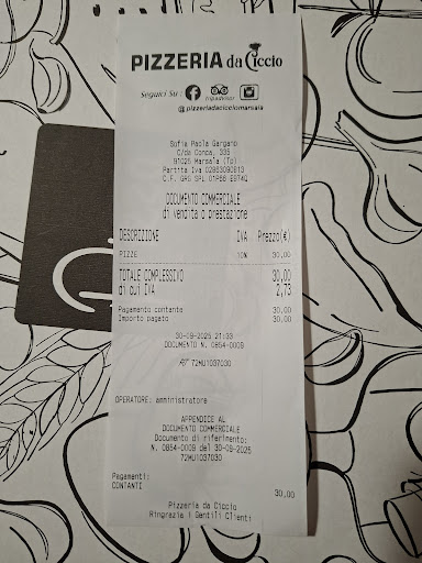 Martedì 30 settembre 2025, di solito la maggior parte delle persone non va fuori a cena in pizzeria il martedì preferiscono il fine settimana, ma si sa si trova molta gente si aspetta di più c'è il rischio di mangiare male. Io preferisco tra il lunedì e i giovedì. Comunque avevo sentito parlare di questa pizzeria quasi anonima in una contrada di Marsala, così decido di andare a provare fortunatamente era aperta( anche perché la maggior parte dei locali il martedì sono chiusi) arrivati e guardando da fuori sembra una pizzeria come tante D'asporto. E invece si è rivelata con mio stupore una grand bella realtà, gestita da una giovane coppia dove il pizzaiolo appunto Ciccio fa delle pizze veramente all'altezza bel impasto condita bene con prodotti di qualità a orizzontale più che onesti, cosa che non trovo mai, sicuramente qualcun'altra lo farà ma vi posso dire che una delle pizze era con base pomodoro e il pomodoro era la classica passata che si fa a casa un sapore d'altri tempi. Poi ho chiesto del peperoncino e con mia sorpresa mi portano una bottiglia sarà da 200 ml di olio al peperoncino ma non fatto in casa ma di un'azienda olearia e non solo aveva quello al peperoncino ma anche al basilico e al tartufo, questo ha un costo e di solito nelle pizzerie non si trovano. I tavoli apparecchiati con tovaglia di stoffa sotto e coprimacchie in tessuto non tessuto bicchieri di vetro non usurati e di buon design posate in acciaio con coltello che taglia le pizze, locali nuovi e puliti. Siamo rimasti molto contenti non posso dire altro che in bocca al lupo continuate così e ci vediamo...