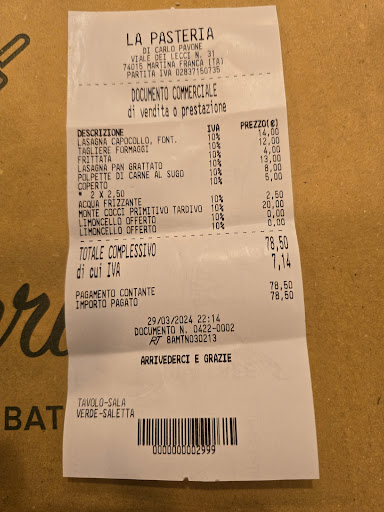 Read moreThe high ratings for La Pasteria are likely influenced by the fact that the owner brings a QR code for Google Reviews just before payment, and guests are expected to leave a review in front of him. This puts pressure on giving a positive rating and may not reflect the actual experience.