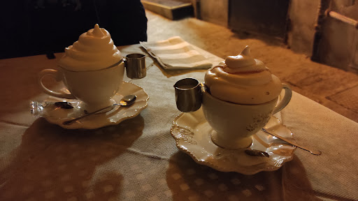Read moreMi spiace ma non mi sento di consigliare questo locale perché si dà un po' di arie ma la sostanza è poca. Abbiamo mangiato fuori nel vicolo, micro tavolino quadrato tipo bar, attaccato al muro, abbastanza traballante per la pavimentazione del vicolo. Io ho preso dei pici, me li hanno serviti in una padella di alluminio. Sarà anche di moda ma io non amo mangiare dalla pentola. Comunque, a parte la pentola, la porzione era risicata ed erano stra cotti. La pasta stracotta è immangiabile. mio marito ha preso la scottiglia ed era buona e anche una buona porzione. Poi abbiamo preso, lui una crema catalana, non era male, io fragole con la panna . Le fragole erano pochine , saranno stare non più di 4, con uno schizzo di panna microscopico. Vi dico solo che alla fine del pasto avevo ancora fame e infatti mi sono mangiata un cestino di pane. Poi abbiamo preso un caffè, serviti come vedete dalla foto , in modo molto sfizioso , con uno spumino sopra e latte ( non chiesto )in un piccolo bricco attaccato alla tazza. Tutta scena, come ho detto prima, ma certamente avrei preferito mangiare meglio. I miei pici erano colla. E pochini. Delusione totale. E anche le fragole di certo non mi hanno soddisfatta per niente !! e in un luogo illuminato. Il vicolo, come cala la luce naturale, è totalmente buio, Abbiamo mangiato con le torce del cellulare altrimenti non vedevamo niente. E secondo me ai gestori è sembrato normale perché andando avanti e indietro sicuramente lo hanno visto ma non hanno fatto nessun commento. Il conto è stato salato. Per un primo , un secondo , due dolci , acqua e caffè, consumati al buio , abbiamo speso più di 60 euro. Esperienza da...