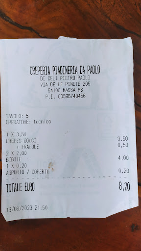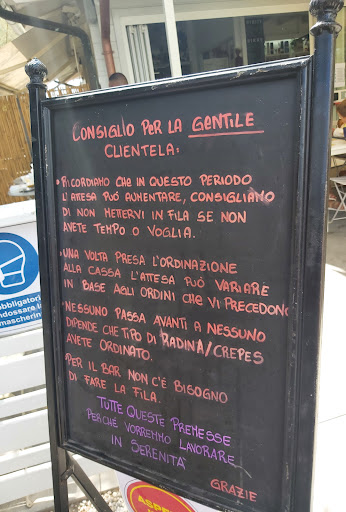 Read moreLa prima volta abbiamo aspettato 40 minuti per fare lo scontrino. Davanti avevamo sì e no 10 persone. E vabbè, era tardi, il locale era pieno, che importa se mezza famiglia era al tavolo ad aspettare me e ovviamente a tenere il tavolo e io ero in fila... Le crepes, arrivate dopo 15 ulteriori minuti, sono abbastanza decenti, ma ho mangiato di meglio. Sicuramente non valgono l'attesa. Ma quando sono tornata a pranzo per 3 piadine da asporto e il locale era praticamente vuoto (3 tavoli occupati, 2 persone in attesa dell'asporto), ok, ho fatto lo scontrino subito, ma dopo 25 minuti ho chiesto spiegazioni! “scusa... Sono 25 minuti che aspetto!". La cameriera controlla, dice che le stanno per fare. Mi metto ad aspettare lì accanto, e dopo pochi minuti la ragazza che farcisce le piadine mi dice che sai, c'erano molti ordini, c'è gente... Le rispondo che però mezz'ora è tanto, e lei che fa? Mi dice che se ho fretta posso andare alla focacceria poco distante! Quindi, se non avete ore da buttare in fila per del cibo di qualità medio bassa, la focacceria è il top, fidatevi della tizia...
