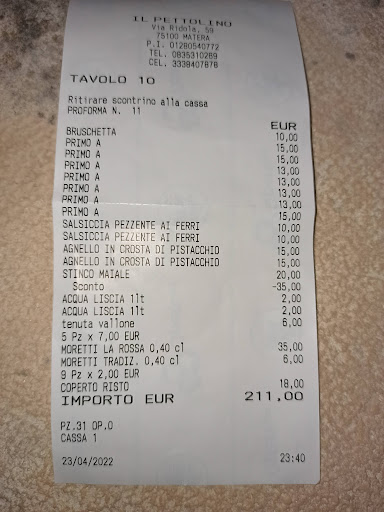 Avoid this restaurant at all costs. There are plenty of other places where you can find quality food, reasonable portions, polite service, a pleasant atmosphere, and, most importantly, respectful and transparent treatment. I will never return to "Il Pettolino," and I strongly recommend that others steer clear as well. What was supposed to be an enjoyable evening turned into a nightmare, and I’m just grateful it’s...