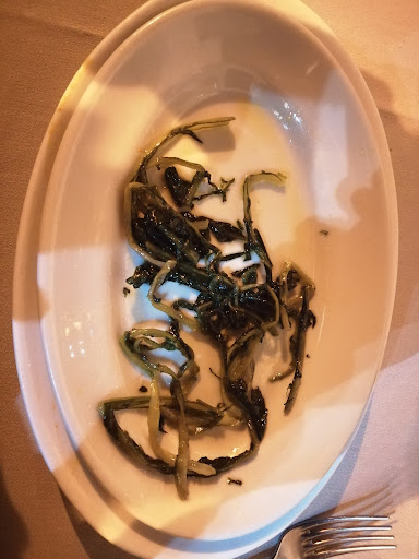 Les plats arrivent assez vite ainsi que les vins et c'est la désillusion. Le vin est simplement mauvais, tanique et astringent (la bouteille a elle seule coûte probablement le prix payé pour le verre) les antipastis assez neutres et pas très goûtus (les planches de charcuteries des tables voisines avaient l'air mieux présentées), l'accompagnement de "fried greens" est un choux amer bouilli et gorgé d'huile (voir photo) le seul point positif est les pâtes qui étaient plutôt bonnes.