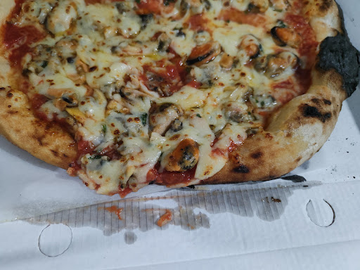 Aggiornamento: mi hanno risposto dicendo che ho letto il menù vecchio perché sulla "frutti di mare" non mettono pesce spada; io vi consiglio di aggiornare i menù su Just eat e Facebook. Mi hanno detto che i gamberetti "sono stati una loro dimenticanza", sottolineo però che l'avete "dimenticato" 2 volte. Poi io non mi sono lamentata delle bolle nel cornicione, ma dell'impasto bruciato e la farina bruciata sotto. E comunque, sulla digestione, io personalmente sono stata male. Sull'arrivo della pizza nelle condizioni in foto, non commento neanche perché ne ho mangiate di pizze "stracondite" (come hanno scritto loro), a domicilio, e non sono mai arrivate così. Questo è successo perché appena uscita dal forno, è stata sicuramente sballottata durante il trasporto e la mozzarella è strabordata.
