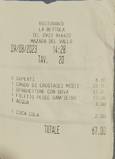 Read moreOnestamente ero partito con le migliori intenzioni. Di buonumore siamo usciti dall'hotel sul lungomare per andare a piedi a mangiare del buon pesce fresco a Mazara. La nostra prima scelta era inspiegabilmente chiusa di domenica a pranzo ad agosto, quindi siamo venuti qui nonostante qualche recensione mi aveva già lasciato perplesso. Quando siamo arrivati ci hanno fatto accomodare in una verandina chiusa e ben climatizzata, facendoci sedere in un tavolo largo e con del buon tovagliato. Abbiamo ordinato delle cruditè di crostacei misti perché solo gamberoni non era una scelta a menù. Ci hanno portato 4 scampi molto freschi e 3 gamberoni di seconda scelta di livello abbastanza mediocre. Dopo 20 minuti finalmente ci hanno tolto i piatti vuoti dal tavolo. Dopo altri 15 minuti ci hanno portato la bottiglia di acqua che nel frattempo era finita. Dopo 40 dagli antipasti ci hanno portato i primi. I tagliolini all'aragosta erano nella norma, è un piatto che difficilmente può essere sbagliato. Il cous cous era letteralmente il peggiore mai mangiato a anche fuori da Mazara. Visto che stavamo sprecando una domenica abbiamo saltato secondi e dessert per andare via immediatamente. Credo che le recensioni positive vengano tutte da turisti che non sono abituati alla cucina siciliana e che sono facilmente impressionabili. Chi è abituato a mangiare del buon pesce nei migliori ristoranti non può di certo dare 5 stelle. Nonostante ciò andrebbe anche bene se il cibo fosse servito in una trattoria economica a gestione familiare. Quando però ci sono 4 camerieri per 6-7 tavoli e il servizio è così scadente nonostante la pretesa di essere considerato un ottimo ristorante, le cose cambiano. Poi il conto: come segnalato anche da altre recensioni hanno il vizio di aggiungere cose non ordinate, come del beveraggio in più. Il conto di 103 euro non è stato scontato per gentilezza come farebbe qualsiasi ristoratore di esperienza ma solo perché gli abbiamo fatto notare l'errore dell'acqua. Per riassumere, il personale o è poco sveglio o non gradisce le famiglie con bimbi che vengono trattate come ospiti sgraditi. Inoltre si sarebbero anche potuti evitare questa recensione chiedendo come fosse andata piuttosto che manifestare interesse solo per farci pagare in oltre 90 minuti di permanenza. Consiglio di andarci solo se non c'è altro. Il cibo non è un granché ne in termini assoluti ne relativi al prezzo. Il servizio è uno dei peggiori mai visti. I prezzi sono, a parità di qualità, il 20-30% più cari della concorrenza. Inoltre la location non è sicuramente di pregio come può essere una terrazza sul lungomare. Non ci torneremo, ma credo proprio che non gli importi e che puntino sui...