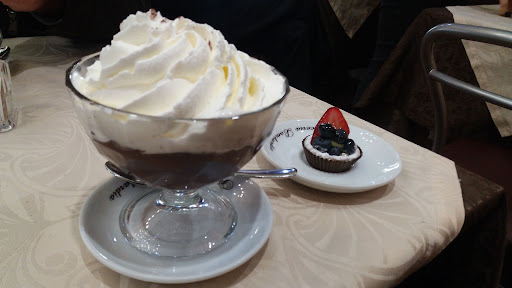 Ottima cioccolata con panna montata. La panna una vera crema montata a pressione, la cioccolata non troppo dolce, il tutto servito in una grande coppa di vetro dall'imboccatura larga in modo da poterci tuffare il cucchiaino senza far traboccare tutto. Pasticcini alla frutta buoni ma non eccezionali. Servizio poco soddisfacente: inizialmente ignorati, poi dopo una lunga attesa veniamo...