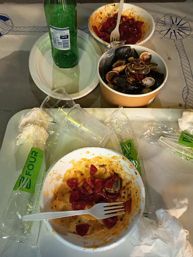 Abbiamo preso in 3 persone due antipasti misti di crudo con un arrosto misto di seppia, gamberi e pesce spada, un piatto di lasagne ai frutti di mare ed un piatto di pennette con sugo di cozze e vongole.