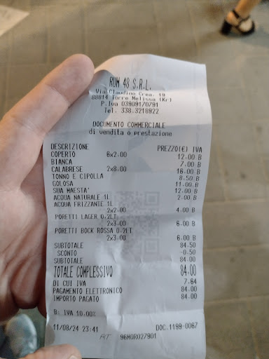 Alle 23.41 ci spostiamo alla cassa per chiedere il conto. Ci serve il proprietario che ci chiede se volevamo un caffè o un amaro (non credo di aver capito se era offerto o meno), in ogni caso decliniamo e ci porge il contro di 84,50€ chiedendoci in maniera meccanica se è andato tutto bene, e a quel punto manifestiamo la nostra profonda delusione da parte del servizio. Da parte sua si scusa ed inizia a giustificarsi asserendo nell'ordine: la mancanza di un lavapiatti lui in prima persona si è dovuto occupare di lavare i piatti e servire ai tavoli l'impasto quel giorno era difficile da stendere hanno servito più di 300 (trecento) comande.