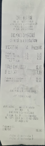 Due prosecchi riempiti in meno della metà del bicchiere a spumante, 3 euro cadauno, praticamente neanche un sorso.. ciotoline per l'aperitivo con noccioline e tarallini già preparati palesemente già servite ad altra gente visto le condizioni in cui erano. Quando ho fatto presente alla ragazza che la dose era misera a rapporto al prezzo, se n è lavata le mani, dicendo che così le viene imposto dal suo...