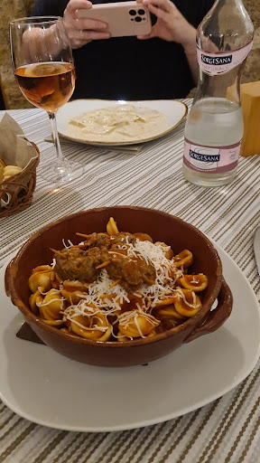 Proprio nelle vicinanze di Porta Grande, questo ristorante si presenta con colori caldi, tovaglie bianche e luci calde e luminoso, una via di mezzo. Struttura rustica, vini d'esposizione, qualche quadro moderno, un antibagno ed un bagno pulito alla fine della stanza. C'era un buon odore incluso il menù cartaceo. Ero informata sui prezzi e avevo già letto le recensioni ma mi aveva colpito il menù. Molto vasto e pieno di antipasti ricchi e gustosi ma non volevo riempirmi. Mi è stata portata una bruschetta definita poi frisella, con olio, pomodorini, la classica, poi il solito cesto con pane e taralli. Così ho scelto come antipasto delle semplici polpette fritte, ce ne erano almeno 10 e non le ho finite tutte! Molto buone, calde e morbide all'interno. Non ho aspettato molto per il primo, forse perché eravamo poche persone. Come primo piatto ravioli cacio e pepe con fonduta al parmigiano. Una bontà sebbene 11.50 per 6 ravioli l'ho trovato un po' troppo come prezzo ma essendo un ristorante, penso sia sempre un po' più alto. Mi ha colpita la forma del piatto che era ondeggiante, non proprio così comoda se non sai come mettere la forchetta... Ero piena e sazia con poco, ma la scarpetta con quella fonduta l'ho fatta. All'inizio pensavo di prendere un bel dolce ma non ce l'ho fatta. Complimenti a tutti! Non ci sono stati problemi, personale attento e veloce e poi ho visto tanta disponibilità e gentilezza....