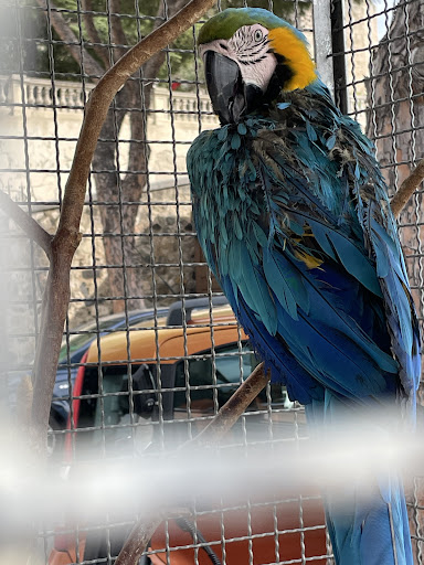 The cafe keeps a parrot in a cage and it is very neglected. It is plucking its feathers and going bald. I have a parrot at home and know the difference between molting and plucking. It does not have clean water or enough food. Please give it better food, like pellets with vitamins