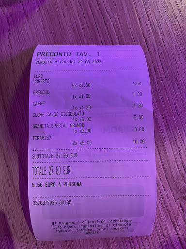 Read moreAndato di sera per prendere qualcosa con gli amici, il posto è carino ma onestamente per qualità prezzo non ritornerò più. Oltre il fatto di aver fatto pagare il coperto per due caffè (ci poteva anche stare una maggiorazione del 10% come fanno altri posti in zona) più caro dei caffè stessi e aver servito una brioche dura come le pietre siamo rimasti delusi per quanto abbiamo pagato… posto carino per ciò che propone ma eccessivamente caro. Aggiornamento dopo la risposta: Purtroppo nessuno mi ha informato del supplemento dovuto all’intrattenimento della serata e ne tanto meno era scritto nel menu questo supplemento “per serata a tema”. Il locale comunque era mezzo vuoto e non penso abbiamo occupato un tavolo per far stare qualcun altro in piedi fuori dal locale… Poi dalla mia recensione si evinceva che è normale pagare una maggiorazione per il servizio ma secondo me non può essere superiore almeno al prezzo di un caffè! Il fatto non è non esserci capiti ma la vostra mancanza di trasparenza, perché se mi fosse stato detto che non facevate servizio di caffetteria (cosa che ho chiesto e mi è stato detto di sì senza far riferimento al costo aggiuntivo dell’intrattenimento) avrei ringraziato lo stesso e me ne sarei andato. Oltretutto non abbiamo consumato solo caffè, come si evince dallo scontrino che ho pubblicato, ma abbiamo preso anche dei dolci dove è stato giusto pagare in quel caso il coperto.Sarebbe bello accettare le critiche anziché contestarle arrampicandosi sugli specchi, perché a parte la brioche dura come la pietra, per il resto non ci siamo...