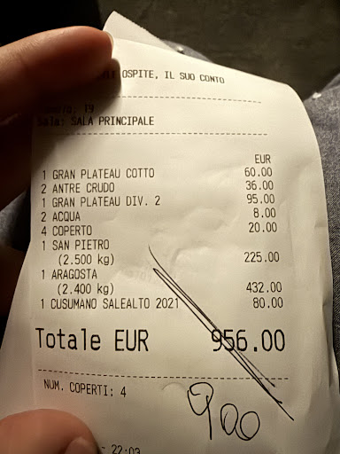 We were a group of four and ordered a hot and cold seafood platter, a lobster pasta , and a fish of the day. The waiter selected a fish but did not tell the weight before cooking.. We only order one lobster pasta. When the food arrived, four portions of lobster pasta were served. The waiter said they may have some misunderstanding, but there was nothing they could do. The final bill showed the lobster pasta to be over 400 euros, and the lobster was charged by weight, which was far different from the price on the menu(about 30 euros). Furthermore, the waiter never mentioned that the lobster in the pasta dish would be charged separately.