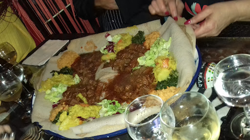 A rare experience in African culture, this restaurant look authentic enough, as far as I can tell, and the offering is of good quality. The restaurant is nicely arranged with exotics and low table (avoid, ask for “normal” table). The menu offer a kind of one dish, a serving of veal, lamb and chicken with vegetables and and spices on a large spongy bread. The plate is placed in the centre of the table and everybody serves himself with his hands. Emergency forks are provided on request, though. We were a party of four and we went for a plate with all different meats. Portions are very generous and almost all patrons left some food. The meats were perfectly cooked and very tender. A good experience. Service extremely kind and attentive, waiters all Eritrean. Bill came at a very reasonable 25€ per person, 2 beers, water and typical...