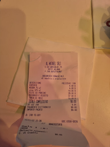 Read moreNon è la prima volta che sono stato Al Matarel. Il decor del locale è un po' kitsch ma quello lo si mette in conto , in effetti è una trattoria. Però questa volta mi ha deluso. Appena arrivato ho notato dei bellissimi porcini. Saduto al mio tavolo sono stato servito da due camerieri di cui uno un poco " confuso". Ho chiesto se i porcini si potessero avere semplicemente grigliati , risposta : no, o fritti o alla genovese. Decido per i porcini fritti e proseguo con l'ordinazione, ossobuco con risotto ( un classico). Pane: zero , due pacchetti di grissini. Il cameriere chiede : mi ha chiesto acqua gasata giusto? Rispondo con una battuta : no, però ha azzeccato. Vino, chiedo se c'è qualcosa al bicchiere. Risposta : no , mezza bottiglia di Chianti. Accetto la proposta. Arrivano i porcini, grigliati. Ottima qualità. Poco sale, ma riesco a farmelo portare. Arriva il piatto principale; l'ossobuco è straordinariamente alto. Mi dico proviamo. Assaggio il risotto, non male. Provo la carne, assolutamente cotta male, sembrava un lesso senza alcun sentore della mitica gremolata. Dopo un paio di tentativi desistito. E qui arriva il peggio, decido di provare il midollo: disgustoso, rancido. Mangio qualche forchettata ancora di risotto e poi smetto. Si avvicina un cameriere ( quello più professionale) e mi chiede: non era buono ? Rispondo :mi spiace, purtroppo no. Chiedo di ritirare e di avere , per piacere, una fetta di torta di mele. Mentre degusto il dessert (discreto) si avvicina l'anziana proprietaria. Stupita dal mio giudizio. Io, dopo averla ringraziata per il suo interessamento, ribadisco le mie ragioni, facendole comunque i complimenti per la sua professionalità. Lei si dice dispiaciuta e , vantando i suoi oltre sessanta anni di carriera, mi dice che farà le sue rimostranze al macellaio. Dopo qualche minuto si ripresenta con degli ossobuchi crudi , apparentemente belli ( anche se decisamente alti rispetto agli ossobuchi milanesi tradizionali) . Ringrazio di nuovo per il suo interessamento e le faccio nuovamente i complimenti per la sua professionalità. Chiedo il conto :€98,00. INACCETTABILE : in un locale così, con un servizio così, con un ossobuco così ( il vicino di tavolo, casualmente un cuoco professionale, era accorto della cottura sbagliata del piatto ) .Dopo sessant'anni di carriera la signora dovrebbe sapere che il minimo che avrebbe dovuto fare esarebbe stato il togliere il piatto incriminato dal conto o ,come minimo , uno sconto. Un trattamento simile da persone che servono cibo guasto non lo accetto. Se la titolare non è piu capace di svolgere il suo lavoro è il momento che si prenda il meritato riposo .Un conto come quello della Bice a Milano o dell'Harry's Bar a Venezia loro non si possono permettere il lusso di...