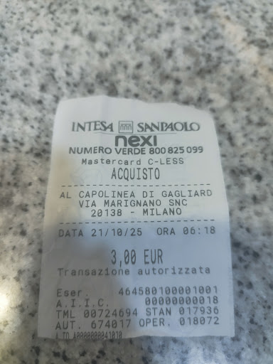 Read moreLa cassiera bionda sui 50 ha la brutta abitudine di gonfiare i prezzi.Ho preso una cioccolata calda e ho pagato 3€.....poi ho visto il tipo del bancone addetto al bar che di metteva una mano davanti alla bocca per non farmi vedere che le diceva che il prezzo era 2.50.Non hanno i prezzi esposti e se ne approfittano.A me è la prima volta che lo fa,ma c'è stato altro episodio dove una ragazza ha segnalato l' errore(forse conosceva i prezzi). Consiglio una visita della guardia di finanza al più presto.Erano due scontrini,quello specifico se lo...