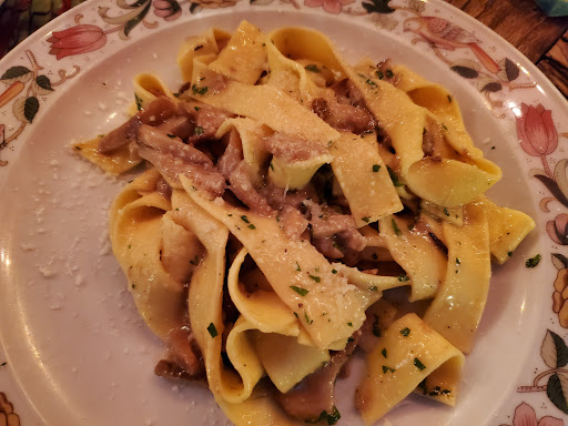 I had two amazing meals here. First time a baked kind of buffalo cheese stuffed with anchovies, then papardelle, wonderfully soft but solid, with a rich veal sauce, and a steak cooked to perfection, juicy and tasty. Second outing started with nervetti and another side of mortadella with fried cheese, and then a superb primo of papardelle with divine porcini mushrooms. Both meals were accompanied by a slightly acerbic volcanic Sicilian white wine, and all served with attentive but relaxed service. Highly recommended! (I didn't have room for dolce, but the other diners around me who did looked...