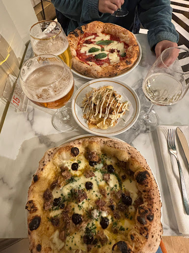 Detto ciò , una degustazione davvero competente, a ruota di carro la pizza dunque cornicione non eccessivo e sottile come piace a me, cottura uniforme e perfetta; ATOMICA la pizza BIGA con quella crema di piselli e guanciale che escono fuori, un’altra suprema è stata la pizza del mercato di Napoli, davvero una roba INDESCRIVIBILE;