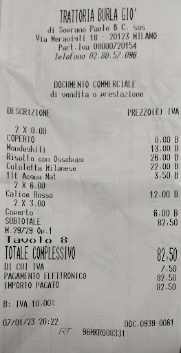 Read moreWe had our best meal in Milan at Burla Giò! We ordered risotto milanese and ossobuco, and both were outstanding. Risotto was smooth and creamy, and far better than the risotto of another trattoria we tried. Ossobuco was the highlight of our meal: fork-tender and full of flavor. The cozy atmosphere and traditional interiors added to the pleasant dining experience. The servers were so kind and accommodating. We arrived before lunch opening and there was a small line; by the time we went out, the line was already very long! No wonder this family-run trattoria with a 50 year tradition has been highly recommended by locals and travel writers. We look forward to...