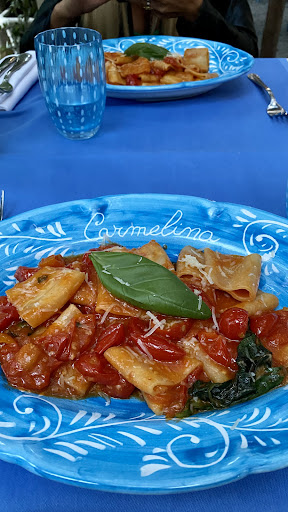 “Il Tuo viaggio per la Costiera inizia da qui: Carmelina e’ il profumo dei limoni quando apri la finestra, e’ il caffe’ caldo che sgorga in cucina, e’ il colore dei fiori che dipingono ogni paesaggio, e’ il sapore del sale che si attacca alla pelle..” Questa la presentazione sul loro menu’ ma per chi non avesse voglia di leggere, Carmelina e’ un luogo, due sale una piu’ bella dell’altra, dove gia’ all’ingresso, abbracciati dal cordiale sorriso di Martina, ci si sente accolti come se si entrasse in un ristorante, anzi in una locanda, della Costiera Amalfitana.. Le mille maioliche appese alla parete, i pavimenti in ceramica decorata, gli affreschi, i quadri e la mise-en-place raccontano di un ambiente raffinato e raccolto, dove un sottofondo lieve di musica esclusivamente italiana accoglie, anzi accompagna l’avventore al tavolo e nella lettura del menu’.. Ma noi, per questa serata tanto eccezionale, ci siamo subito avvalsi dei preziosi consigli di Pasquale, padrone di casa e chef dallo spiccato accento napoletano, sfaccettatura che in un luogo che vuole richiamare “la Costiera” e’ davvero cio’ che serve per mettere la cosiddetta ciliegina sulla torta. Ci propone (e poi corre in cucina a preparare) un antipasto decisamente ben assortito di fiori di zucca, montanare alla Nerano, zeppoline di alghe di mare, insalatina tiepida di mare e polpettine di melanzane dalle quantita’, dai profumi e dai sapori tipicamente partenopei. Ed il vuoto con cui ci eravamo apprestati al tavolo e’ gia’ (in buona parte) colmato. Ed una bottiglia di ottimo prosecco mantenuta fresca nell’elegante glacette a bordo tavolo fa scorrere in gola quelle mille bollicine italiane di cui non possiamo piu’ fare a meno.. Con la quiete di una cena dai ritmi ben calibrati, che sapientemente deve saper coniugare la buona tavola al convivialita’ degli ospiti, Pasquale recapita al nostro tavolo una pirofila di pasta e patate con provola e cialde di parmigiano che avrebbe saziato almeno 4 commensali.. ma il problema dell’abbondanza non sussiste, cio’ che “non ci sta” non si butta, anzi, si porta a casa con un packaging degno di una boutique del centro.. ed il giorno dopo, appena riscaldato, sara’ ancora squisito quasi come alla prima forchettata di stasera.. Ancora un attimo di pausa ed ecco un altro piatto che ci fara’ dimenticare, nella mezz’ora successiva, di essere a Milano: una squisita ricciola con vellutata di marroni che, se si fosse potuto gustarla ad occhi chiusi, ci avrebbe accompagnato in riva al mare la’, in uno dei luoghi piu’ blasonati al mondo per la bellezza e l’infinita tranquillita’ dei suoi paesaggi. Seppur ormai sazi, noi poveri milanesi abituati al panino in piedi in metropolitana, la tradizione napoletana esige che non ci si possa alzare da tavola senza aver assaggiato, ovvero condiviso la delicata dolcezza di qualche piccolo cannolo, di un Baba’ che trasuda Rum da ogni poro, un assaggio di tiramisu’ ed ovviamente, l’immancabile caffe’. E purtroppo, come le migliori fiabe, anche questa incantevole serata volge al termine. Pasquale e’ un amico, oltre che uno chef ed un papa’ prossimo a tenere in braccio.. chissa’.. il Suo principino? la Sua principessa? A lui, alla Sua splendida famiglia ed a questa eccellente Locanda i nostri migliori ringraziamenti e gli auguri per un futuro...