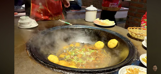 Restaurant from the north east of China, where the extreme cold influences the food, that needs to be hearthy, warm and nourishing to face temperatures that drop below 20•Celsius The Chinese Tie Guo Dun (铁锅炖) or “Iron Pot Stew”, is a Dongbei “dish” centered on a deep cast iron pot, whereby soup, chicken, pork, vegetables, noodles, and corn cakes are thrown in and cooked all together. It’s similar to Sichuan’s Gan Guo or “Dry Pot”, or like hotpot with less volume of soup. Similar to hotpot, you first choose a “stew base,” a harthy stock to broil your order of meats, vegetables, noodles and whatnot. The bases include pork,chicken-mushroom, goose and fish. We went for the signature free-range chicken. A whole free-range chicken—gizzards, liver, hearts and all—is cooked long and slow in an already rich stock with ginger and spices. That soup is tumbled into a massive cast-iron pot in the center of the table, along with the foodstuff you’ve ordered. Here are a few things ordered: goose claw, greens, black ear mushrooms, tofu skin, potatoes, rice cake, oyster mushrooms, tea tree mushrooms, and spare ribs, mountain yam and potato tagliatelle. One must-order is the corn cakes (玉米饼), an essential item of the whole ensemble. These corn cakes are affixed to the side of the pot just above the simmering line of your stew. The catch about ordering them is that you can only do it once, before the pot is covered to stew. So be sure you have enough of those before the lid goes on. The mealy corn cakes are crisped on the bottom with a fluffy center, making them an ideal vessel to soak up all the stew. Oh, and every time a pancake is placed uon the pot, the server bellows idioms of well wishes. Eat the pot stuff with a raw garlic and chili dip. Definitely...