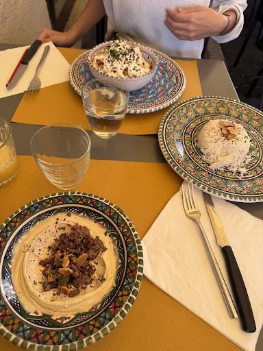 The food was absolutely delicious and even though the portions don’t seem big, they’re huge! We had the fattet shawarma (chicken strips with something like fried tortillas, spices, and yogurt sauce) and hummus with meat. They came with white rice and Libanese bread.