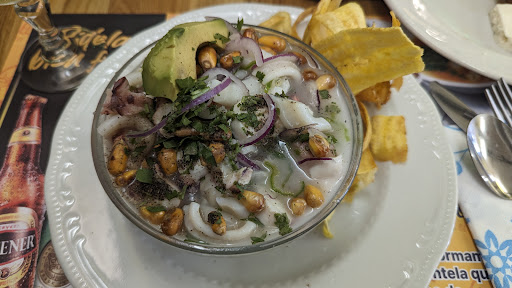Muy malo el ceviche de pescado le ponen demasiado limón amargo, eso parece 1 plato de caldo, sirven en bandejas chiquitas rebotando el líquido que te moja todos los chifles. El pescado huele muy mal, no es fresco. Organización pésima. Todos gritan, uno pide la orden pero empiezan a desfilar por todos lados con los platos y no sirven a todos los de la mesa por igual. Nosotros ya terminamos y a mi pequeña hija nada que le trajeron su plato, mi cuñado italiano tuvo que levantarse a decirles que porfavor traigan el plato de la niña. Yo reclamé que ese ceviche no me agradaba y me trataron malísimo todos relajados como que estan en su barrio salitroso. Luego porfin vi llegar la propietaria y viene toda mechosa y lagañosa a decirme que de dónde soy? Que el ceviche costeño es así.! Que ella porque va perder, que debo ser yo que tengo la boca amarga. Me discutió como una vieja callejera problemática. Y se fue diciéndome que hago eso de reclamar porque me mata la envidia. Ojo....envidia, cuando en mi vida nunca la e conocido ni en pelea de perros la e visto. No sé nada de cómo vive ni de dónde salió. Y ella no sabe lo feliz e intachable que es mi vida y mi familia, que ni siquiera demente me gustaría estar en sus zapatos. Mi hermana pidió una guarita le trajeron toda seca espesa, sin madurito frito, le pedimos y dejaron esperando pero nunca trajeron nada. El jugo de maracuyá amargo super ácido. Que vergüenza toditos allí amontonados a quererte vender mercadería de dudosa procedencia. Que no sabrán que van ciudadanos italianos a descubrir lo lindo de nuestra gastronomía y ellos con toda su vulgaridad callejera nos hacen quedar muy mal. Muy mala experiencia. Ten cuidado donde van a tener mal rato y hasta...