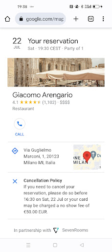 Personally I felt there was some racial discrimination going on. I made a reservation for dinner and made an upfront payment of 50 euros for my reservation. On the way to the restaurant I called them to tell them I was running a bit late so would arrive about 10 mins later. Waitress who answered the call was extremely rude and said that my reservation didn't exist and I probably booked another restaurant. She asked me not to come. I said it was impossible because the taxi confirmed it's this address too. So anyway I arrived and I go to the restaurant and showed them my booking on Google (as shown in screenshot) as well as my name numerous times. I said this is the correct address and restaurant. The waitress that answered my call attended to me and was extremely rude. She insisted that there was no such booking under my name and the Google confirmation reservation is not proof I made a reservation. Asked me to go somewhere else with a snide attitude. I was insistent I 100% made a booking and to seat me because I already paid the 50 euros deposit. Another waiter came to see the commotion and then he asked if I had an email reservation besides showing on Google that my reservation is confirmed + the 50 euros deposit. Luckily I had data and could look through my emails and found an email booking confirmation and showed them. Waitress wasn't happy about it and left me with the other waiter to sit me down. They hid me at the back of the restaurant and I felt so humiliated and degraded by this whole racial profiling and rudeness I couldn't wait to eat my food and leave because I was scared they would spit in it too. I was also ready to give at least a 30 euros tip for this dinner alone but the experience was so horrible I finished my dinner quickly and left. Thank you for making my time in Milan the worst.
