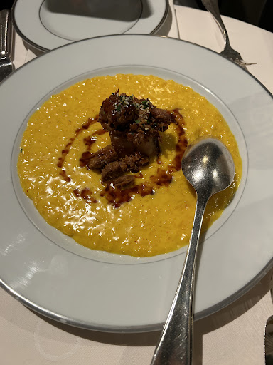 The food was mediocre and served cold, the biggest disappointment of all. The lobster ravioli was €38 and there were only 5 ravioli and a sauce that tasted like thinned out off-brand canned tomato sauce. I had to intentionally taste the sauce to try to figure out what it was supposed to taste like. The saffron risotto with shredded veal was flavorful but was way too salty. The risotto was salty, and the veal was even saltier. But it was more enjoyable to eat than the lobster ravioli. The lemon came through and even the small cut of bone with the marrow wasn’t too rich or overpowering.