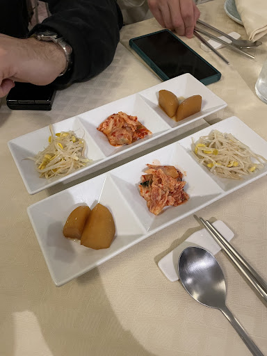 Delicious Korean Spot! Such a great find! My colleague suggested this place to me and I am glad he did it! The staff were super friendly and made us feel really welcome. They started us off with some banchan—kimchi, marinated potatoes, and bean sprouts—which were all super tasty. We also got fried chicken to share, and it was just perfect: crispy on the outside, juicy inside, and full of flavor. For the mains, my boyfriend had bibimbap, which came beautifully arranged with fresh veggies, beef, and a raw egg yolk on top—ready to be mixed with the warm rice. I had beef soup, which was light but super comforting, with tender meat, glass noodles, and egg. They also served it with a bowl of rice, and I actually learned that eating rice with chopsticks is considered rude in Korean culture—so that was an interesting little cultural insight! The atmosphere was nice, though they don’t have many dessert options. Still, the food was amazing, and I’d definitely...