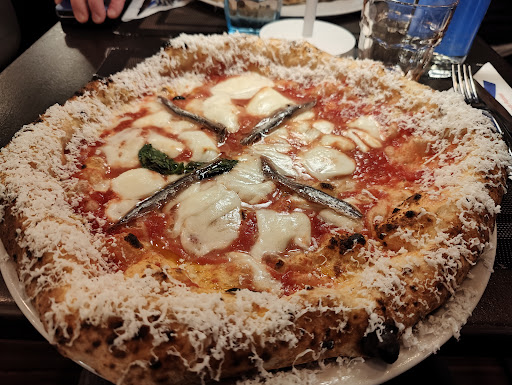 Read moreMa sì dai complessivamente mi sono trovata bene soprattutto per quel che riguarda la qualità del servizio, veloce e accurato grazie a una cameriera sempre presente e intelligente e al caposala vigile e concentrato sui clienti. L’ambiente è uno strano mix con elementi che non sempre sembrano conciliabili. Comunque è presente un mosaico di piastrelline sfumate che rappresenta più bimbi su una moto (e questo a Napoli mi dicono che è comune), delle piastre di metallo con dei buchi che vanno a formare dei ferri di cavallo che poi si ritrovano anche sui tavoli (come portafortuna immagino), una tappezzeria stile anni ’70 (fiorita e vagamente psichedelica), dei vetri separatori dipinti di azzurro con funzione presumo anticovid ma che al contempo penso vogliano rappresentare il mare. Insomma un po’ di Napoli qua e là mischiata ad altre cose meno comprensibili. Ci starebbe senz’altro un interessante discorso con l’architetto che però naturalmente non era presente. Nel complesso l’ambiente a piano terra è abbastanza piccolo e poi c’è un piano di sotto, che non ho potuto vedere bene dove sono presenti altri tavoli. In questo periodo festivo i clienti sono pochi e non ci sono problemi ma può darsi che nelle giornate normali in cui ho visto che è sempre pieno il servizio sia peggiore qualitativamente. La pizzeria Sorbillo nata nel 1935 è presente in più città italiane (almeno 5 se non ho visto male) ma è anche un brand internazionale (Miami, Ibiza e Tokio). La pizza è quella classica napoletana ovvero con il cornicione e un po’ molle. Personalmente preferisco la pizza bassa e croccante (anche se per i napoletani doc la pizza così non va quasi nemmeno considerata pizza), ma gli ingredienti della pizza che ho preso (salsiccia, friarielli e provola) erano buoni e una volta eliminato il cornicione ho fatto festa con la parte centrale. Consigliato dunque agli amanti della pizza napoletana con tutti i crismi. A Milano stanno crescendo a dismisura i locali che fanno la vera pizza napoletana ma io spero che rimanga qualcuno che la fa bassa o meglio ancora che faccia scegliere al cliente come la preferisce. Per finire il controllo del Green Pass è stato effettuato immediatamente all'ingresso e sempre all'ingresso era presente il disinfettante...