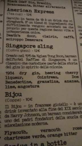 Read moreTwo years living in Milan and this is the best bar that I've found so far. The first impression when you arrive is already "wow"! what a beautiful bar, super elegant but cozy at the same time, nice decoration! Then the guy that served us was extremely helpful and nice, he helped me to find a sweet drink (always with gin) and helped also my boyfriend to choose a dry gin but with special flavour notes. Our drinks seemed 2 pieces of art, since all ingredients seemed to fit perfectly with each other. It was really a pleasure to get those drinks, we then repeated them. It is not cheap, we payed 48 euroos for 4 drinks, but it's worth it!!! If you love gin, you can't find a place with more variety of gin to choose: they have 4 full pages of gin and drinks with gin. I truly recommend it and I can't wait to...