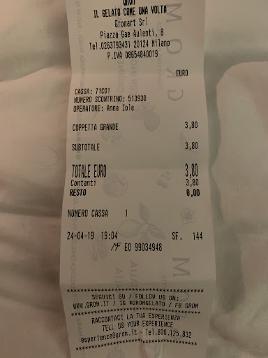 Read moreUnfortunately this GROM was not up to expectations. I do take into account that the place only had one employee and she looked stressed. When we ordered the waffle cone she told us it was all sold out but the waffle cone display was still in front for display. Very misleading so we went with the coppetta grande (large cup) and got the Torroncino and the Crema Di Grom. When she handed us the gelato it was already melting and so the texture and taste went out the window. We ate maybe 3 teaspoons each and we tossed the rest in the trash. The location was great but did not live up to the quality like in Florence. Quality not quantity is key to...