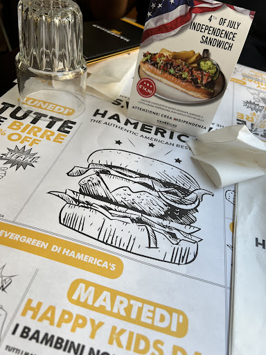 Hamericaâs is a street food/gourmet food restaurant located near the Navigli area, in Milan. The place is clean and it remembers America, so it has the semblances of a street food but with quality ingredients. The menu is vast, and it has also vegan/vegetarian options as there are hamburgers/tacos/nuggets/salads made with plant based meats. The staff is super kind and welcoming, the guy took care of us perfectly! And also the service is very fast. Concerning the food, as I was saying itâs a street food, mainly there are hamburgers, sandwiches, tacos and salads, but the choices are multiples and the menu has a large offer, which could fit for everyone, also vegetarians and vegans. Furthermore the portions are very abundant, the quantities are not excessive but very very big! The only reason Iâm not givin 5 starts is the price: I think that itâs a little bit high, cause for an hamburger and a plant based Caesar salad, with 2 colas and a sparking water it was 42 Euros. But Iâd really suggest to go there, you wonât...