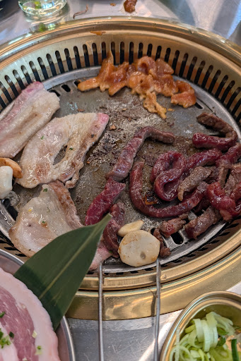 Read moreDopo aver visto un sacco di video che lo pubblicizzavano abbiamo deciso di provare questo locale perché sembrava esserci un sacco di scelta, ma alla fine era un po' meno di quella offerta da altri posti simili e soprattutto non era della stessa qualità. Non mi spiego tutte le recensioni positive e non capisco se sia per il concept del posto o altro. Molta carne era particolarmente grassa e si faceva fatica a mandarla giù perché rimaneva viscidina e stoppacciosa. La griglia con una bombatura un po' eccessiva fa colare subito via tutto l'olio facendo spesso attaccare le cose. L'olio di sesamo di un dolce inusuale, totalmente diverso dal sapore che dovrebbe avere e secondo me l'olio di sesamo è uno dei punti cardine della cucina coreana. Le carote molto "particolari", ma non in senso buono ed il kimchi era il peggiore mai assaggiato. Premettendo che lo mangio abbastanza spesso e so che sapore dovrebbe avere; questo era sotto ogni aspettativa. Super dolce e per nulla simile al suo sapore in qualunque altro ristorante o negozio che lo venda. L'unica cosa positiva è che effettivamente cambiano subito la griglia all'occorrenza rimpiazzandola con una pulita quando serve. Mi dispiace lasciare recensioni negative e di solito mi astengo e basta, ma mi sembra che sia fin troppo ingannevole tutto l'hype per questo posto. Io era più di un mese che non vedevo l'ora di andarci e davvero, con 37 euro ci sono un sacco di posti dove mangiare molto meglio, quindi spero possa essere...