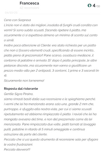 Michela estremamente gentile, professionale e preparata ci ha offerto ottimi consigli! Risultato: una squisita cucina raffinata, ottimi vini, con un servizio impeccabile, piatti di ottima fattura, Ottimo rapporto qualità/prezzo! Le porzioni erano generose e il gusto eccezionale".
