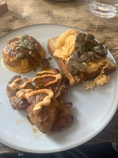Presentation: by wanting to put a simple presentation they have not achieved the objective. Two medium baked potatoes cut in half with a little bit of cream in the middle. A strangely colored scrambled egg, toast that looked like supermarket toast a single mushroom resting on a tahini-like cream that did not match the flavors of the rest of the dish.