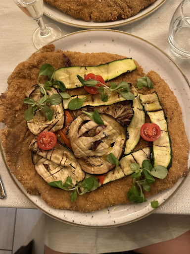 Cotoletta passabile ma tutto il resto da rivedere. Abbiamo prenotato per 10 ed eravamo posizionati in un punto in cui a malapena ci si riusciva a muovere e il cameriere riusciva a servire soltanto i primi due quindi per tutto il servizio è stato un passaggio di piatti continui. Nel momento in cui siamo arrivati abbiamo chiesto di spegnere la stufetta in quanto essendo messi fuori ed essendo circondati da un tendone si era creato l'effetto serra, e fin qui tutto bene; abbiamo chiesto anche se fosse possibile spostare per poco la parte in plastica che si arrotolata in modo da far circolare un attimo l'aria ma c'è stato risposto che non eravamo in Calabria con un tono dispregiativo( preciso che eravamo ragazzi di tutta Italia compresi di milano). Arriva poi un cameriere con uno spumante a caso scelto da lui chiedendoci se lo volessimo come benvenuto e ricevendo la nostra risposta negativa ci ha guardato per l'ennesima volta storto. Dopo neanche due minuti arriva il cameriere che aveva fatto la battuta sulla provenienza, e chiedendoci se volessimo del vino e ricevendo un'altra risposta negativa ha ben deciso che fosse necessario sparecchiare tutti i bicchieri anche questa volta con una catena umana di 20 bicchieri. Inoltre, sul tavolo erano presenti le noccioline americane ma per mettere i gusci c'ero due piatti per dieci quindi per non iniziare un altro passamano c'è chi le aveva messe sul tavolo per poi spostarle, anche in questo caso è ripassato il cameriere della battuta dicendoci che dovevamo mettere sul piatto e non sulla tovaglia; se fossero stati presenti li avremmo usati volentieri. Passando alle cotolette (orecchie di elefante) nulla di eccezionale e se proprio dobbiamo dirla tutta anche secca. L'unica cosa onesta il prezzo, 5 bottiglie d'acqua, 8 caffè e 10 orecchie di elefante compreso di coperto...