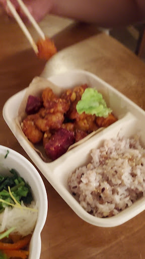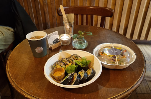 As a fan of the korean culture i couldn't miss the chance to try this particular cuisin. I started learning korean a few months ago by myself and i couldn't resist to taste some of their dishes! I read and saw amazing reviews about this place so i decided to try it myself. I ordered japche and kimbap. They were served in disposable cover, as long as that place mainly serve for take out. It was however presantable and plasant to see with the minimal design. The dishes were a mix of tastes i wasn't familiar with but i find both of them delicious! As beverage i took one of their infusions, the lotus toot one. I literally fell in love with this one and i was genuinely surprised as long as i usually don't drink any kind of tea or infusion. I bought two of their desserts for take away, a cinnamon and chocolate plumcake and the simple shiffon cake. The last one was my favourite! It was super fluffy and i can't wait to try the other flavours. The entire atmosphere was comfy, elegant and calm; wood tables and candels also make the place seem more intimate and personal. I advice to do a reservation to find a table available. The staff was really kind and respectful, i was also really happy as they got my pronunciation and asked me if i knew korean! I definitly need to come back here with my friend and maybe do the ordination...