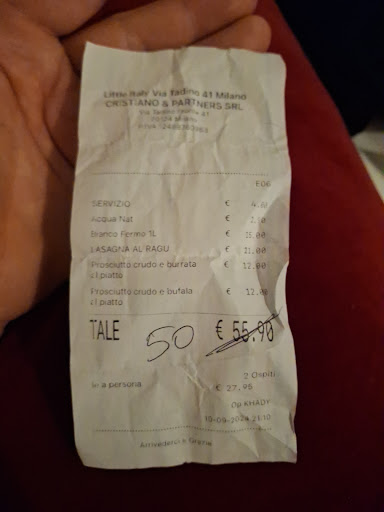 Cost - 37.50 euros La Zuccosa - 12.50 euros Little italy - 12.50 euros Pandistelle - 5.50 euros Coca Cola - 3 euros Coperto - 4 euros ( 2 euros per person )